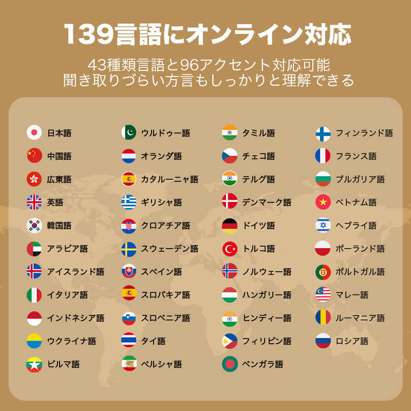 W4 Proは43言語・96のアクセントに対応しています。対応言語は以下の通りです。