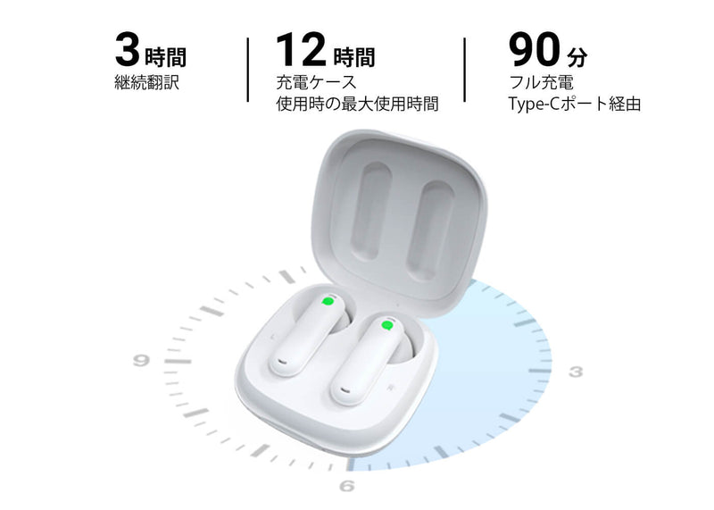 WT2 Edgeは最大12時間の使用に耐えうる長時間バッテリーを搭載しています。1回の充電で約3時間、付属の充電ケースを使用することで最大12時間まで通訳を継続可能です。